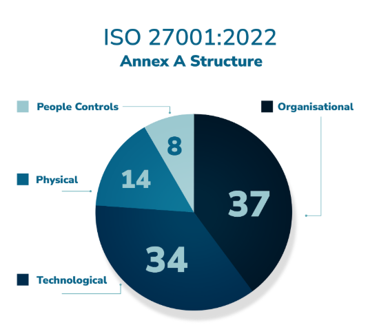 Annex A of ISO/IEC 27001 contains 93 security controls organized into four categories. These controls represent best practices for addressing common information security risks.